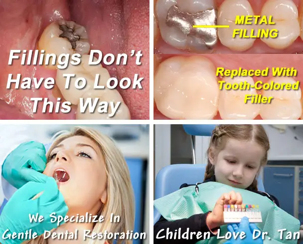 From adolescents and teens to adults and seniors, all patients are susceptible to cavities and small dental defects. Our dentists commonly use a non-metal, durable composite resin filler that can be color matched to your existing teeth. That’s right – no more metal (silver amalgam) added to your mouth and you can always consult with Dr. Tan about having existing metal fillings removed and replaced with tooth colored filler. The aesthetic difference is both amazing and beautiful. These composite resin fillings, when done properly, are just as durable as silver ones and provide excellent cosmetic appearances.